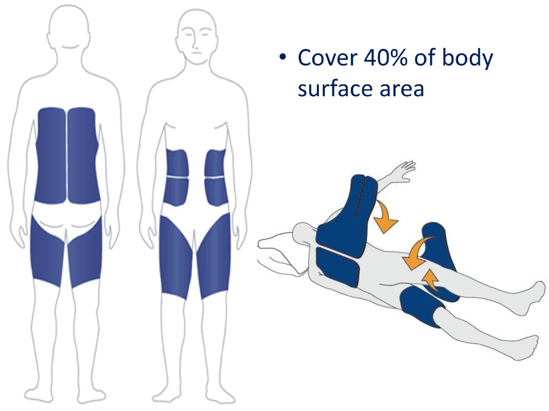 請依照體重選擇,體重35至45公斤適用XS號,45至65公斤適用S號,65至85公斤適用M號,85至105公斤則適用L號,若體重大於105公斤,則需選擇L號並補充貼墊。黏貼時,應覆蓋至少40%體表面積。
