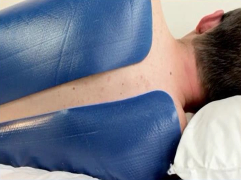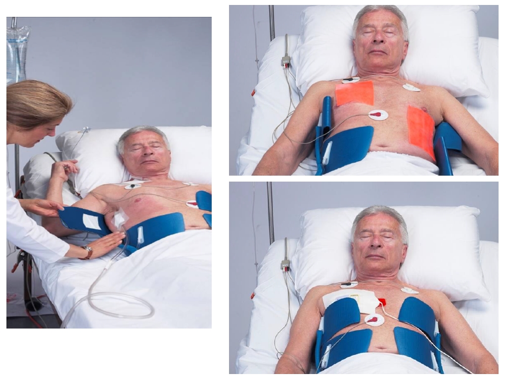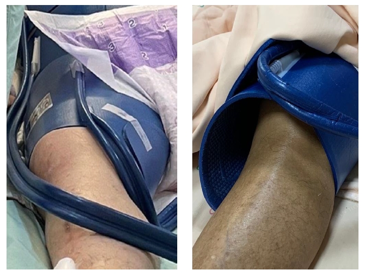 下肢黏貼貼片時,請於膝關節處預留活動空間,並將管路置於軀體前側,避免翻身時受壓。