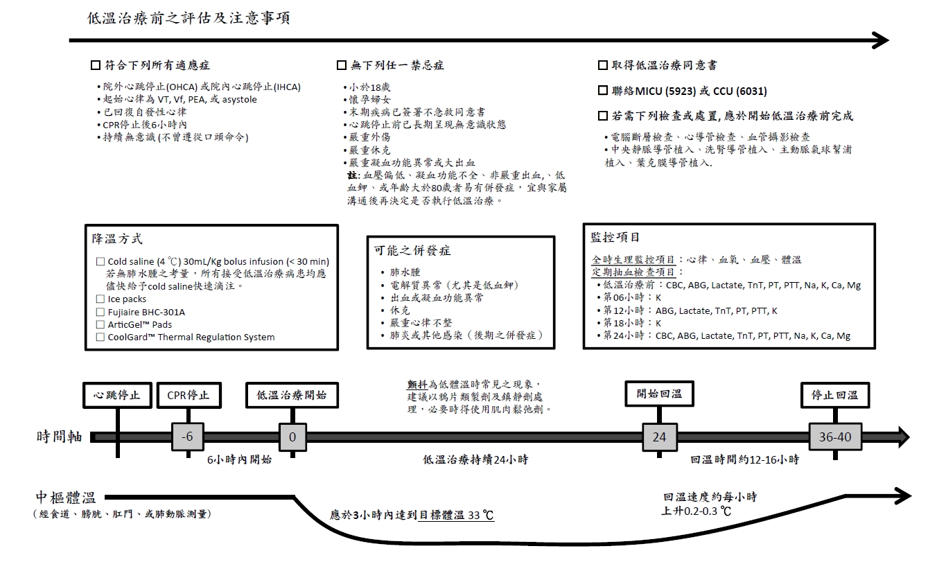 研究指出目標溫控治療(低溫治療)可以改善缺氧後的腦損傷,對於改善復甦後病患的意識狀態有顯著的意義,一般在心跳停止超過5分鐘後,體內的自由基將對大腦造成傷害,正常情況下,當體溫在28℃ 以上時,低溫可減少大腦的電活性(electrical activity),當體溫每減少1℃ ,可減少6-8%腦氧氣代謝率(cerebral metabolic rate of oxygen consumption, CMRO2),亦可降低人體代謝速率及氧氣消耗量,並抑制自由基反應、減緩分解酵素的活性